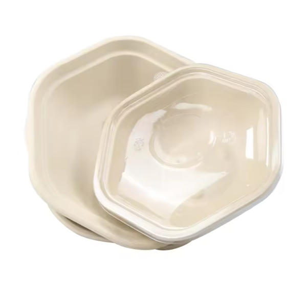 Eco-friendly hexagon-shaped bowls available in 1000mL (large) and 750mL (medium) sizes, designed for food packaging (takeout, catering, events). Made from compostable materials (plant-based fibers) to reduce plastic waste.